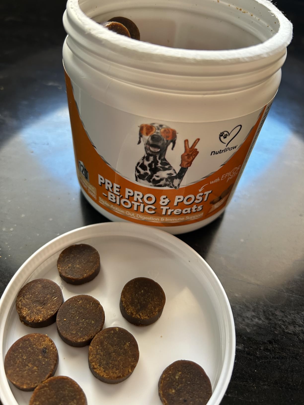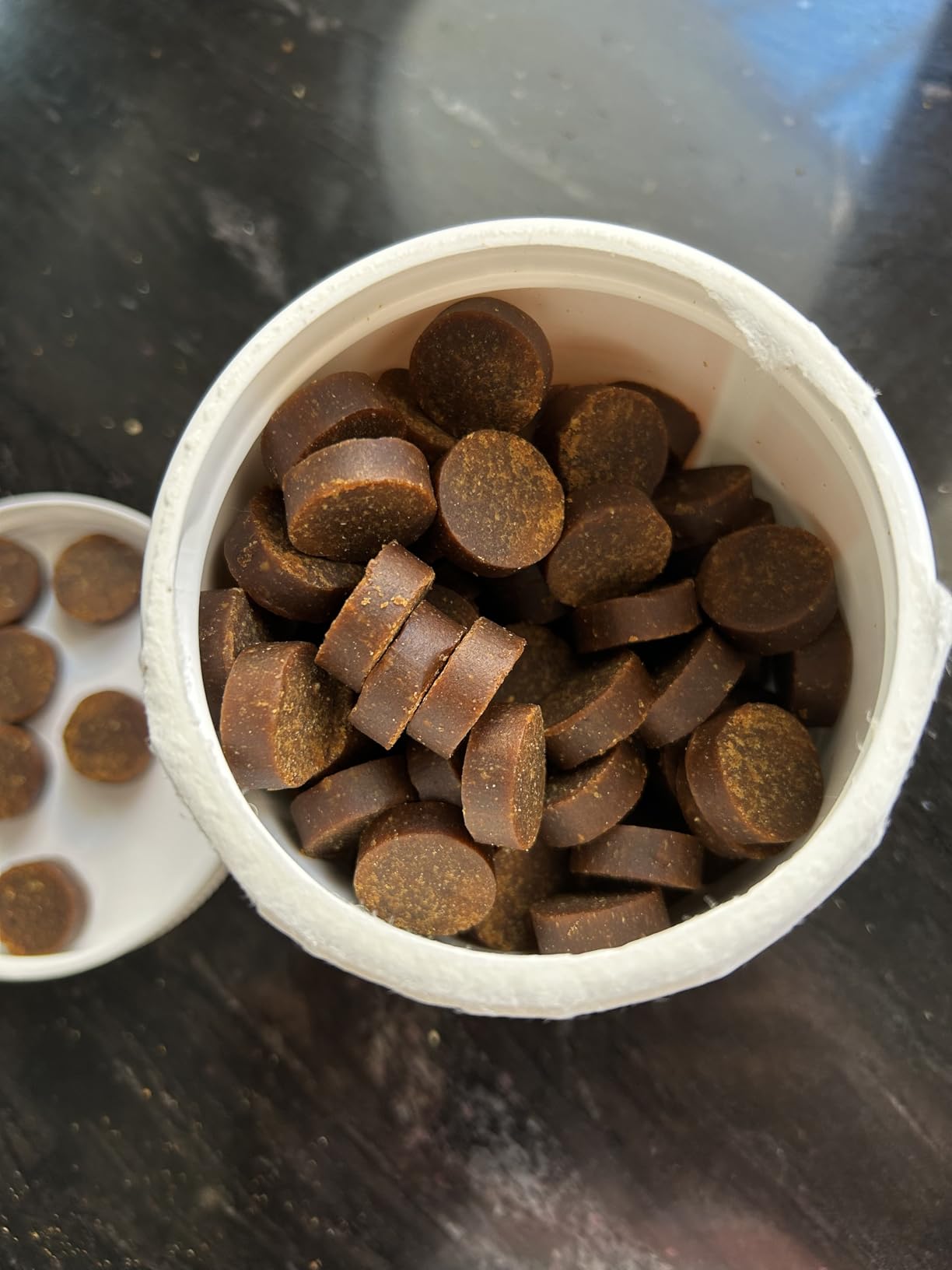 Mezcla diaria con comida o premio. Ajusta según vet.